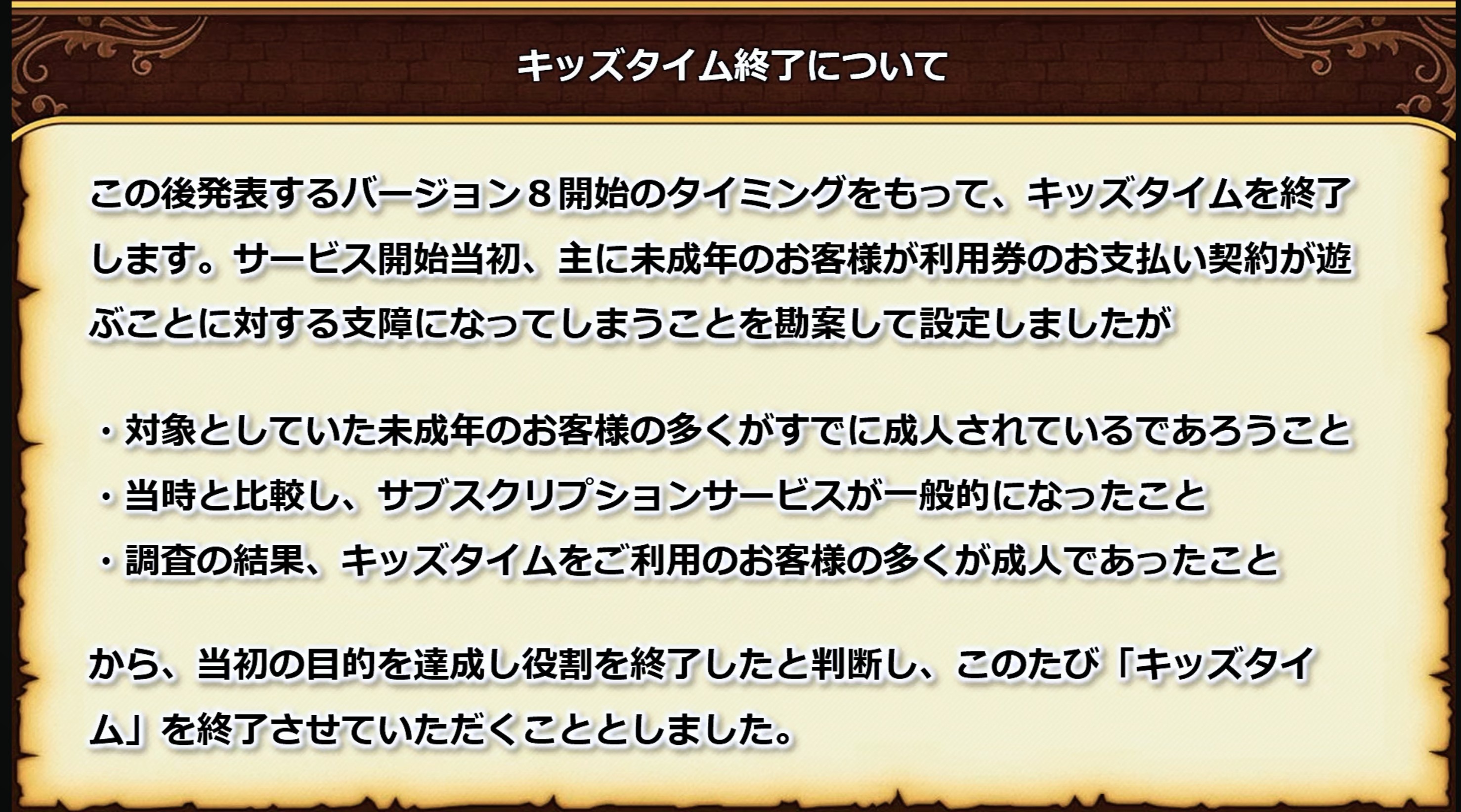 から、当初の目的を達成し役割を終了したと判断し、このたび「キッズタイム」を終了させていただくことといたしました。