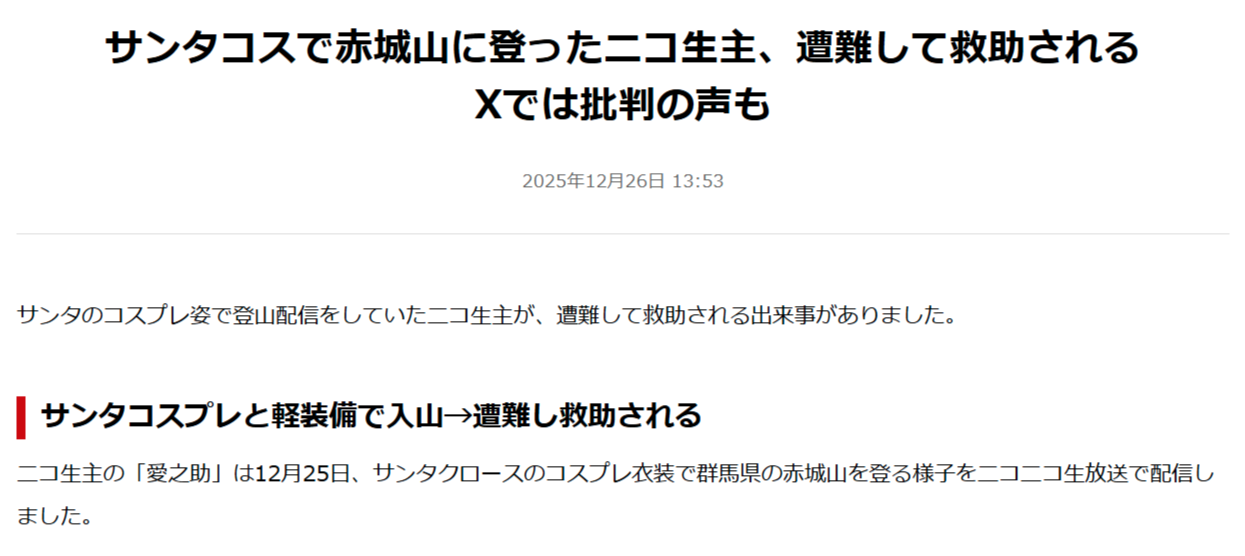 ニコ生主の「愛之助」は12月25日、サンタクロースのコスプレ衣装で群馬県の赤城山を登る様子をニコニコ生放送で配信しました。