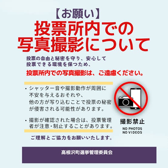 投票所内での撮影は、公職選挙法で直接禁止されていませんが、多くの自治体で投票所の秩序維持のため禁止されています。撮影行為は、他の有権者に不安を与えたり、投票の秘密を侵害する可能性があるため、ご遠慮ください。
